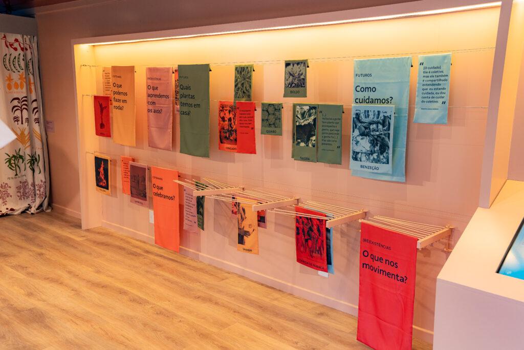 Outro destaque é o Varal dos Saberes, obra interativa que convida o público a refletir sobre os eixos curatoriais da exposição por meio de perguntas, imagens e um mapa digital com informações sobre povos indígenas e comunidades quilombolas de Minas Gerais.